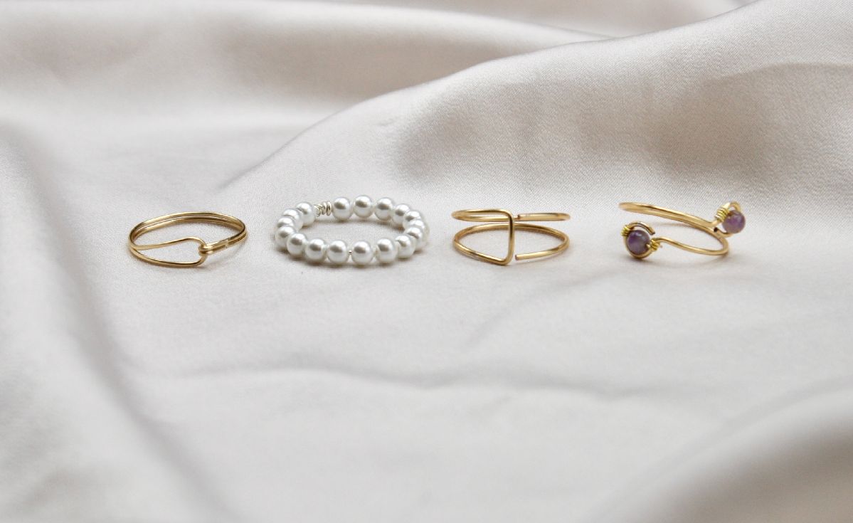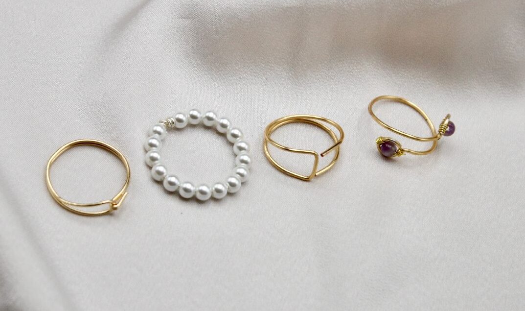 This 4 piece ring jewelry set is handcrafted with 14k gold plated or sterling silver plated wire. In this jewelry set, you will receive a dainty closed loop wire ring, a full pearl wire ring, a double band wire ring, and a crystal double loop wire ring.