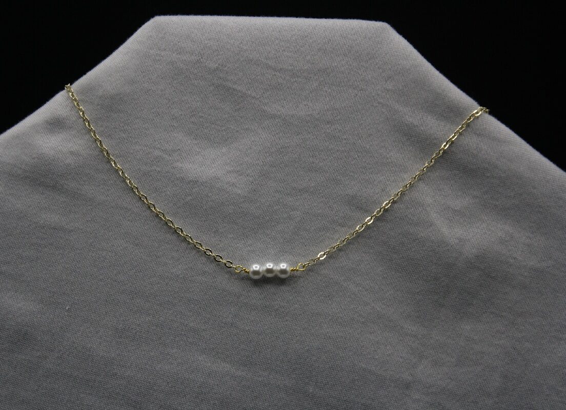 Three white glass pearls on a necklace chain of your choice with a lobster clasp closure and 1 extra inch of chain for fit adjustment of your choice.