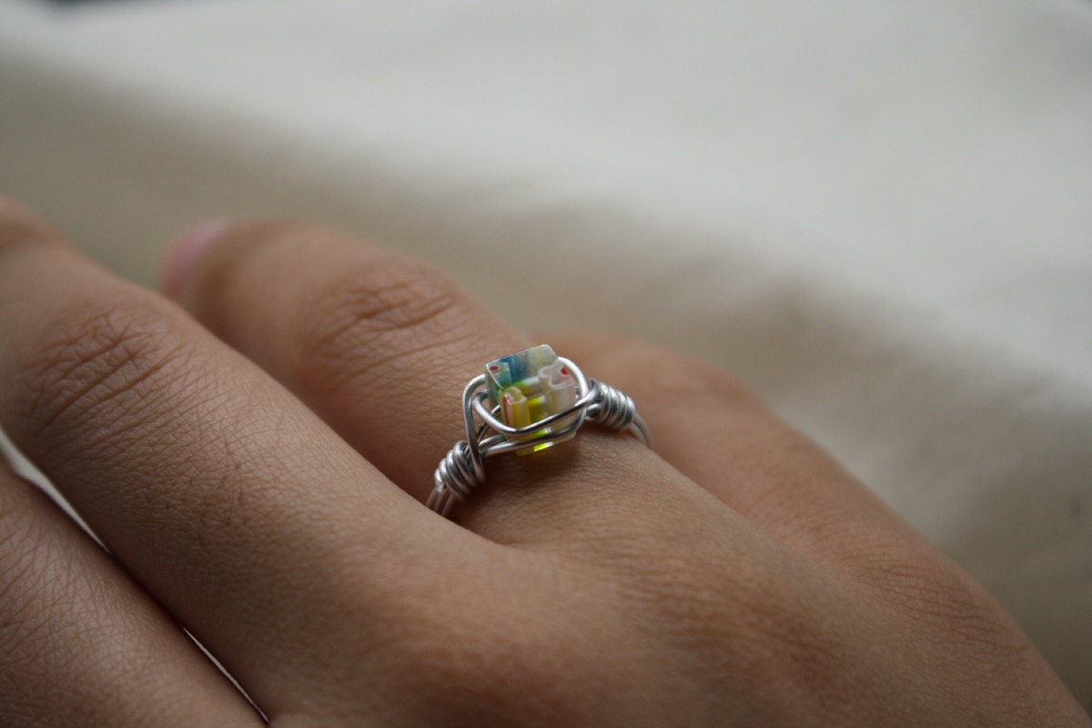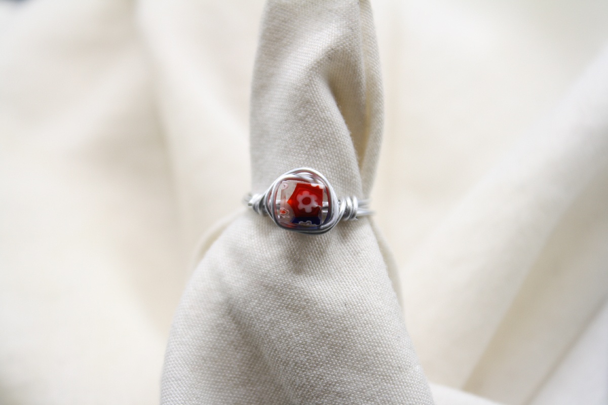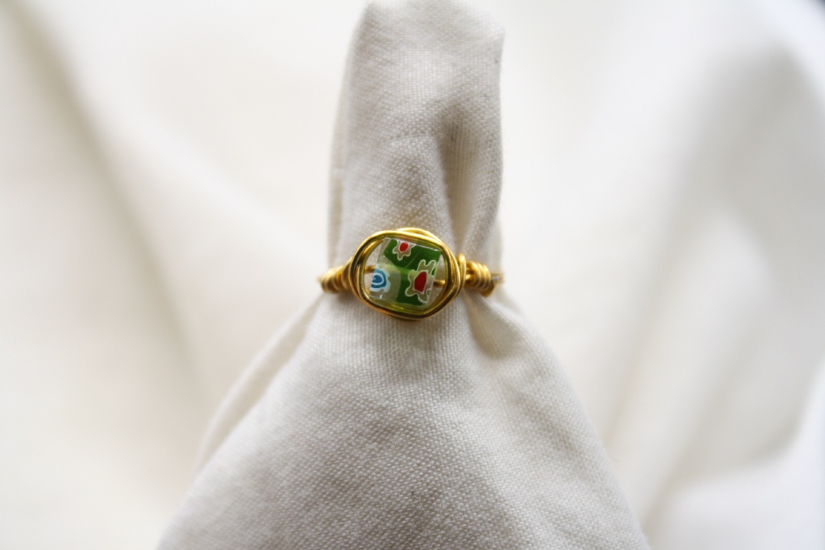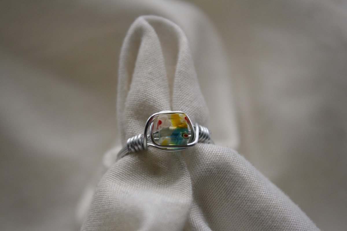 Uniquely handcrafted with wire 20-gauge silver or gold plated tarnish free wire and square multi-colored flower beads in the center of the ring.