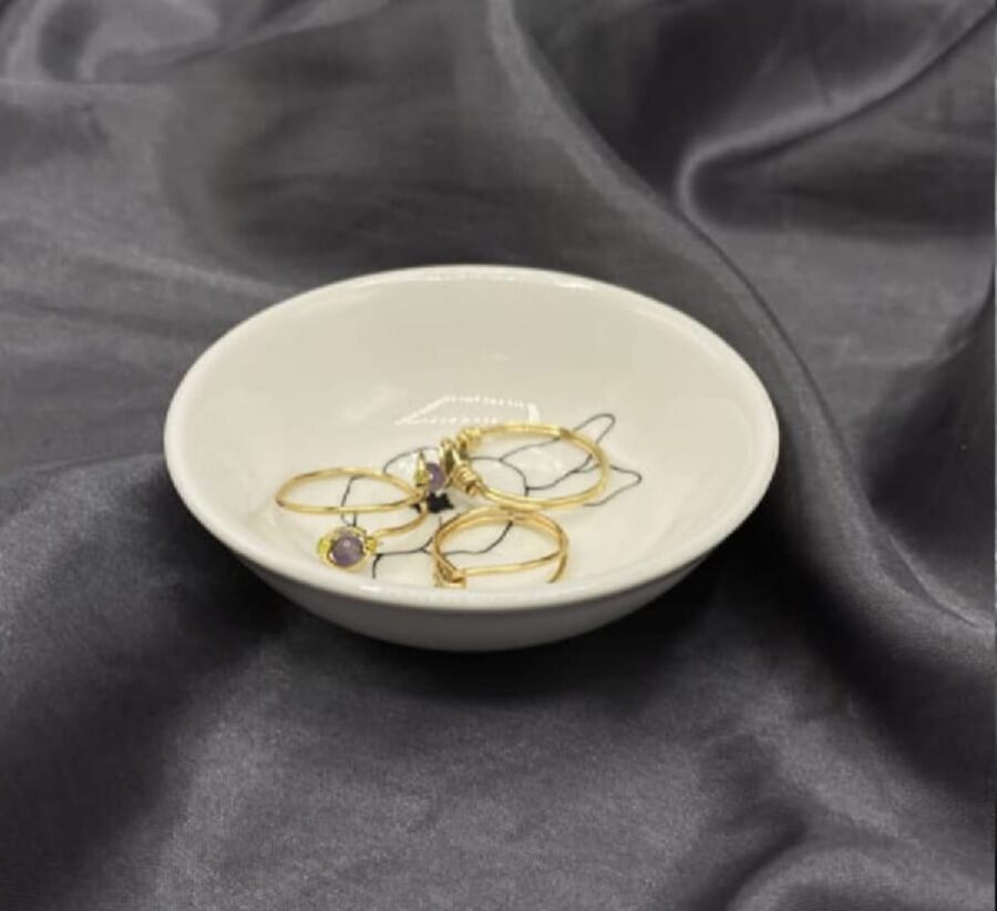 These ceramic trinket tray dishes are customized with long lasting and durable vinyl in a variety of flower outlines. They are created for holding rings and any other jewelry pieces that you want stored and kept safe in your space.