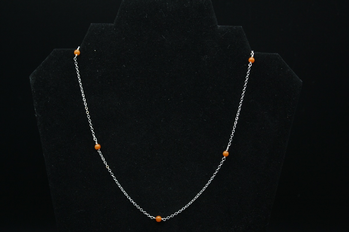 Small colored beads and precious stone with the necklace chain of your choice in between in a pattern with a lobster clasp closure and 1 extra inch of chain for fit adjustment of your choice.
