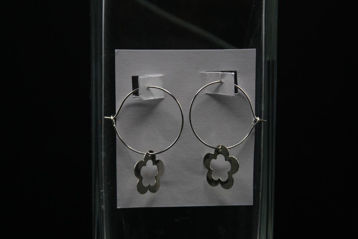 Silver flower charms with a silver hoop earring base. Available in silver.
