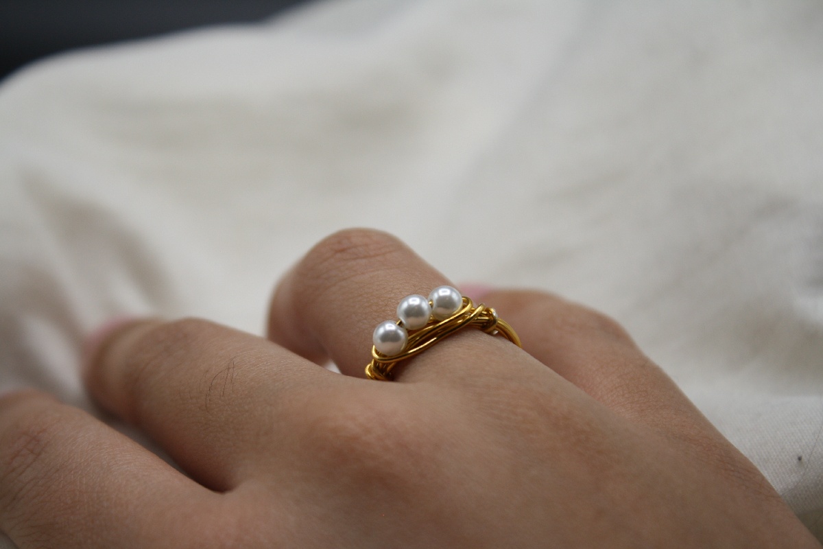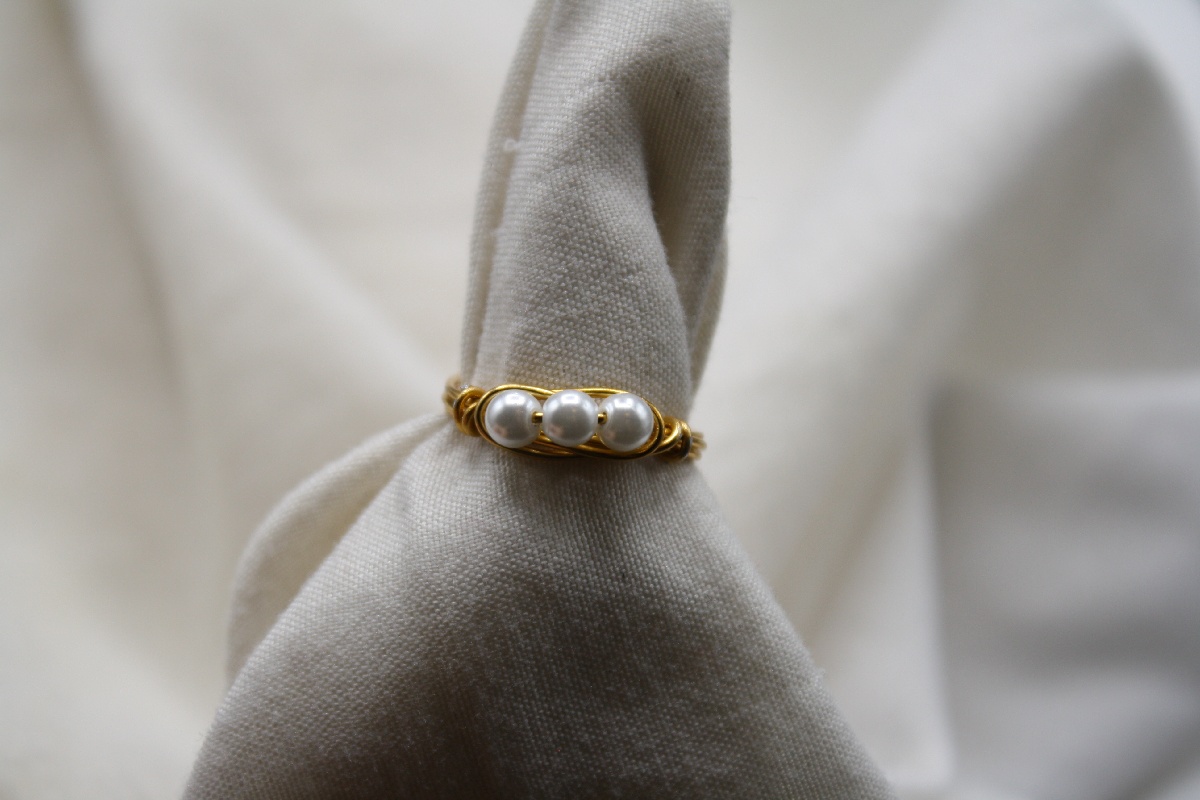 Uniquely handcrafted with wire 20-gauge silver or gold plated tarnish free wire and three white pearl glass beads in the center of the ring.